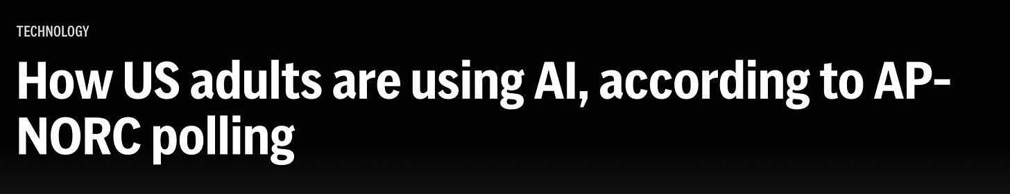 Then there’s that new “catchy word” of Generative AI: the ChatGPT, Claude, Midjourney line of products. Surveys over the last two years generally find that just over 50% of Americans have tried generative AI at least once, but the share of adults who use it as a routine tool for work, study, or personal projects is closer to the teens or low twenties.