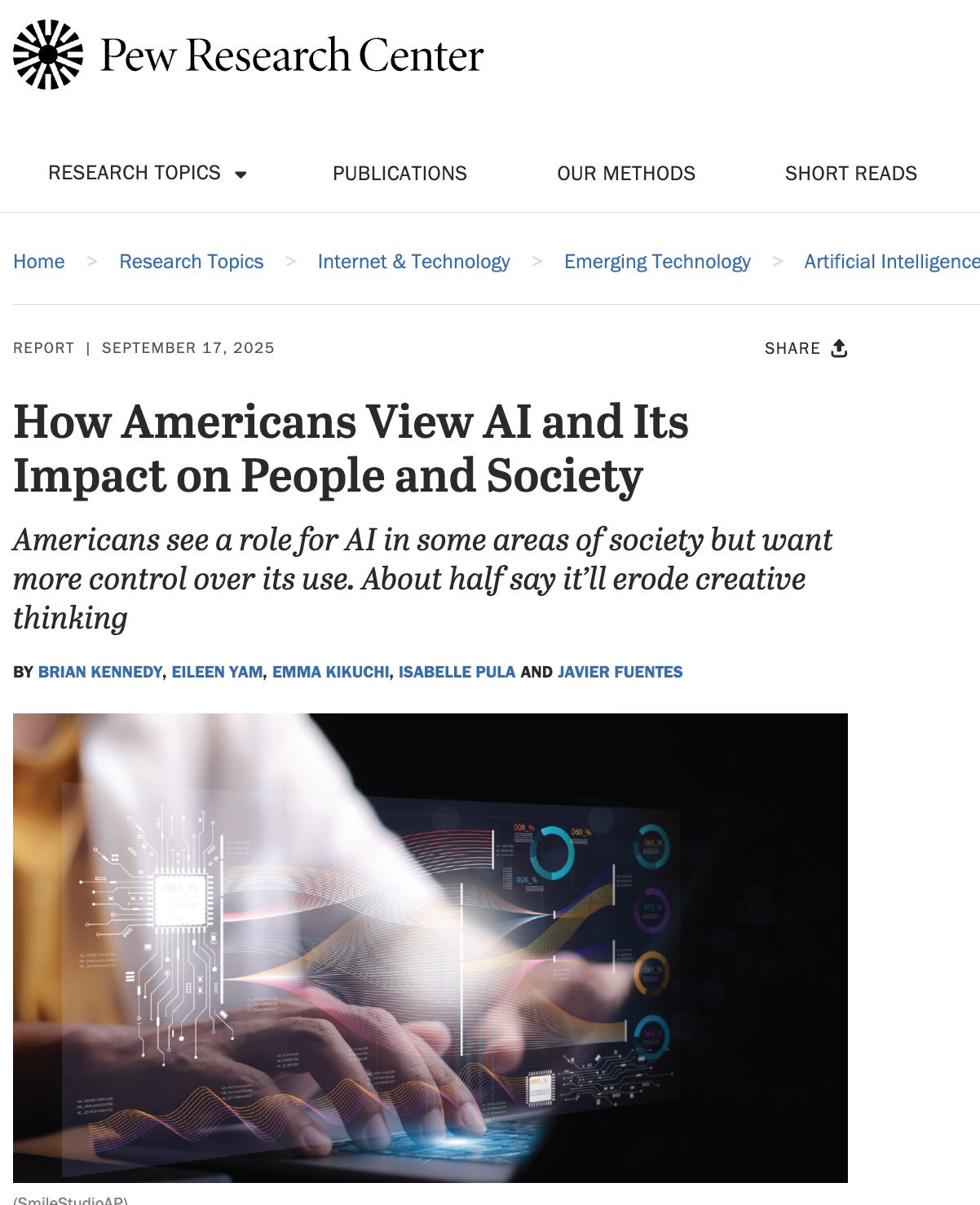 Then, when Pew asked about risks and benefits, a majority of Americans rate the societal risks of AI as high, and only a minority say the benefits are similarly high. The worries cluster around a few themes: loss of human skills and connection, job disruption and downward pressure on wages, misinformation and impersonation, and a sense that the technology might be fundamentally hard to control.