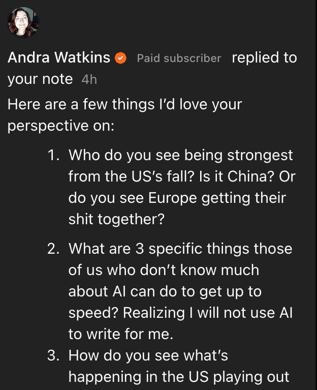 The market’s getting flooded with generic content. This makes your distinctive voice, genuine insight, and lived experience more valuable than ever. The things AI can’t do - original thinking, real voice, human connection - are exactly what readers will pay for.