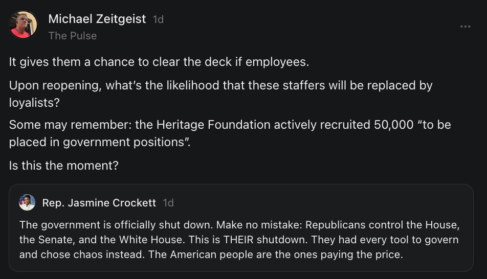 TL;DR: The 2025 government shutdown isn’t about budgets. It’s also not directly about power. Republicans control the House, Senate, and White House. They engineered this. Republicans triggered a shutdown. Thus, one of the remaining options is that the shutdown is about deliberate restructuring of the foot soldiers.
