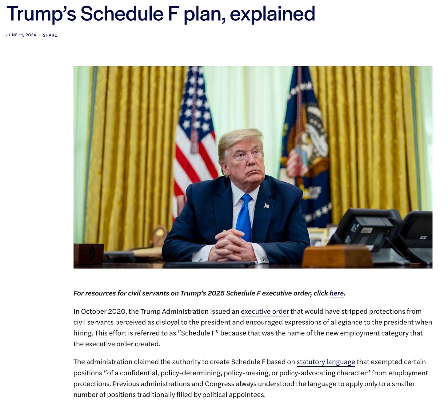 In January 2025, Trump revived Schedule F, which is now rebranded as “Schedule Policy/Career”. It’s an executive order that strips civil service protections from federal employees in “policy-influencing” positions. The order makes them at-will employees, fireable without the due process protections that have insulated the civil service from political purges since the 1880s. Here’s the explanation.